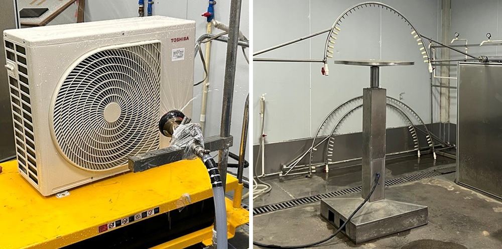 屋外環境試験では室外機への影響が大きな暴風雨など、さまざまな天候を想定し、あらゆる角度からの浸水による性能保全試験を行っています。