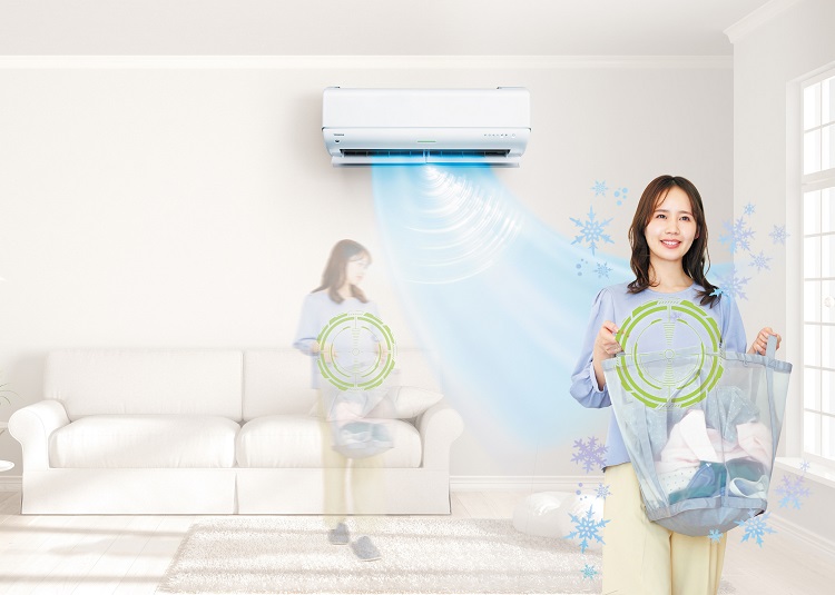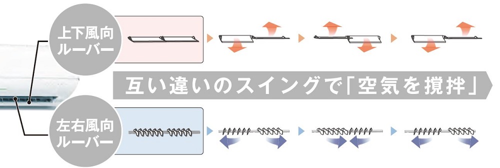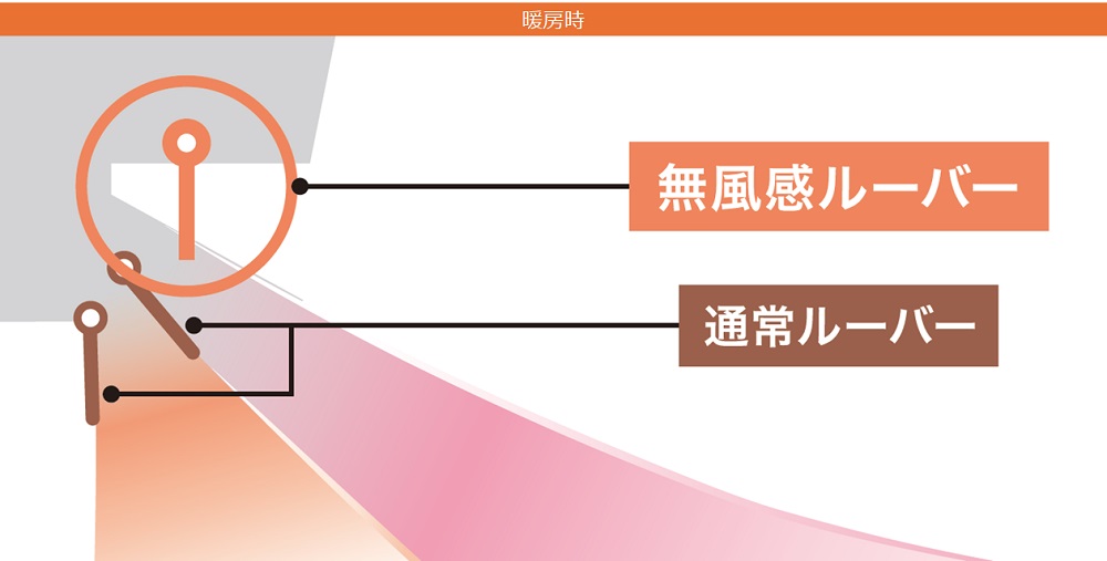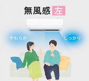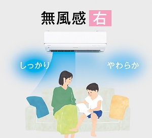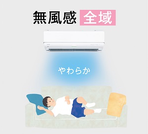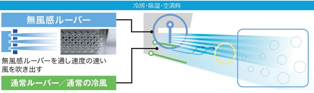 - ※10RAS-V402DRにおいて「無風感ルーバー」動作時、エアコン本体から2.5m、床上60cmの地点で風速が0.2m/s以下であることを確認(当社調べ)。冷房と除湿時は使用環境により動作しない場合があります。