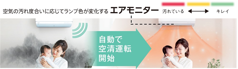 - ※4【試験機関】暮らしの科学研究所(株)【試験方法】31㎥試験チャンバー内にタバコ(5本)の煙を発生させ、エアコンを空清運転。経時的にチャンバー内(室内中央・床上92cm)の粒子濃度を測定。【試験結果】空清運転前に比べ、90分で98%減少。【報告書No.】LSRL-42021-F113