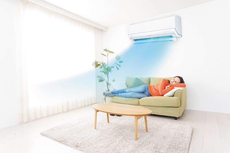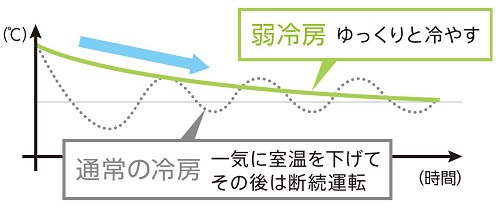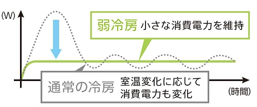 - ※19RAS-V402DRにおいて当社独自の条件により評価。冷房:当社環境試験室(12畳)にて、通常冷房運転と弱冷房運転との比較。外気温30℃、通常冷房の設定温度「27℃」(弱冷房は27℃設定で固定)、風量「自動」にて、運転開始から3時間の消費電力量の比較。通常冷房運転時956Wh、弱冷房運転時494Wh。(エアコンの設置環境、ご使用条件により効果は異なります)