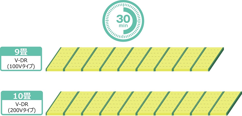 - ※3【試験方法】(一社)日本電機工業会規格「JEM1467:微小粒子状物質(PM2.5)に関する除去性能」による。【判定基準】 0.1㎛~2.5㎛の微小粒子状物質を32㎥(約8畳)の密閉空間で99%除去する時間が90分以内であること。[31㎥(約7.8畳)にて試験。32㎥(約8畳)の試験空間に換算した値です。]
