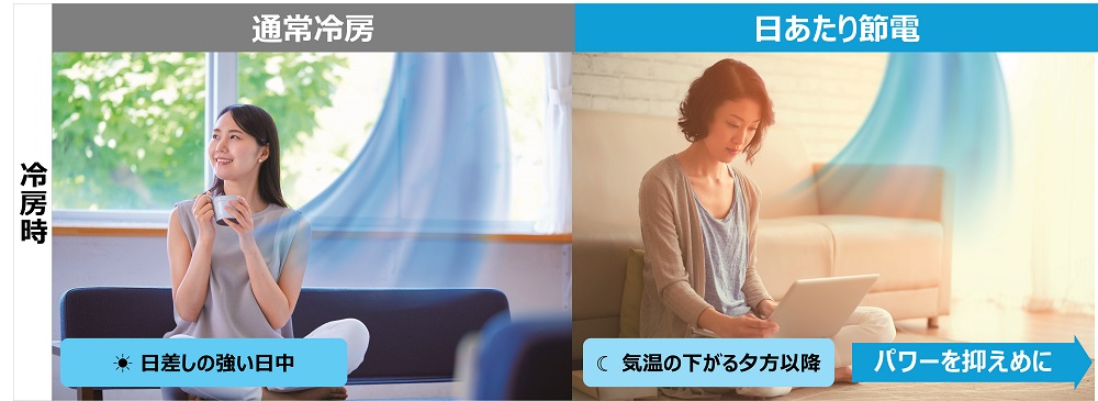 - ※20RAS-V402DRにおいて当社独自の条件により評価。冷房:当社環境試験室(11畳)にて、通常冷房運転と日あたり節電運転との比較。外気温35℃、設定温度「24℃」、風量「自動」にて、安定時1時間の消費電力量の比較。通常冷房運転時262Wh、日あたり節電運転時220Wh。暖房:当社環境試験室(11畳)にて、通常暖房運転と日あたり節電運転との比較。外気温7℃、設定温度「20℃」、風量「自動」にて安定時1時間の消費電力量の比較。通常暖房運転時510Wh、日あたり節電運転時480Wh。(エアコンの設置環境、ご使用条件により効果は異なります)