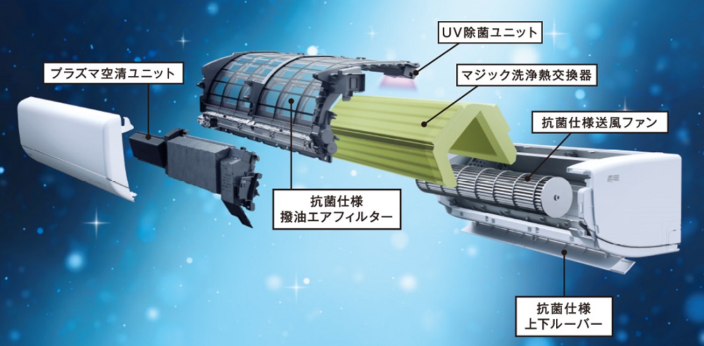 - ※11当社独自の条件により評価。【試験機関】(一財)北里環境科学センター【試験方法】熱交換器に菌(1種類)を付着させ手動クリーニング運転を実行。クリーニング前後の菌数を測定し比較。【試験結果】99%減少【 報告書No.】北生発2022_0178号
