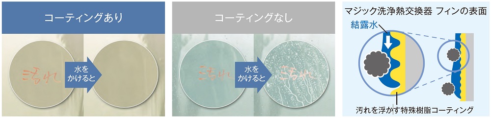 - ※17当社独自の条件により評価。【試験機関】(株)衛生微生物研究センター【試験方法】熱交換器フィン(試験片)にカビ胞子(1種類)を付着させ、滅菌精製水で洗浄。洗浄前後のカビ数を測定(コーティングなし試験片とコーティングあり試験片とのカビ数を比較)。【試験結果】コーティングなし試験片:カビ残存率25.3%に対し、コーティングあり試験片:カビ残存率6.9%【報告書No.】2020D-BT-1041