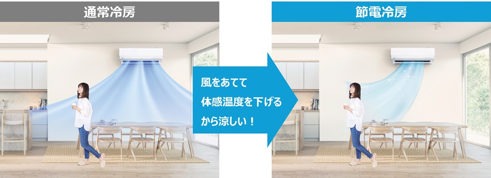 - ※18RAS-V402DRにおいて当社独自の条件により評価。冷房:当社環境試験室(11畳)にて、通常冷房運転と節電冷房運転との比較。外気温35℃、設定温度「24℃」、風量「自動」にて、運転開始20分後から1時間の消費電力量の比較。通常冷房運転時1,132Wh、節電冷房運転時662Wh。暖房:当社環境試験室(11畳)にて、通常暖房運転と節電暖房運転との比較。外気温7℃、設定温度「20℃」、風量「自動」にて、運転開始20分後から1時間の消費電力量の比較。通常暖房運転時933Wh、節電暖房運転時533Wh。(エアコンの設置環境、ご使用条件により効果は異なります)