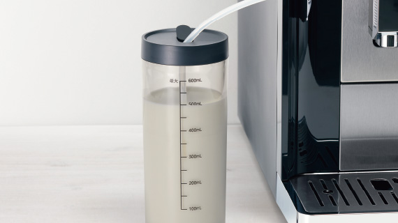 使用時はミルクボトルをチューブで本体につなぐだけ。ミルクメニューで抽出後は「ミルクシステム洗浄のお知らせ」をタッチ。洗いにくいチューブと抽出ノズルの中に付着した牛乳をお湯で洗い流します。