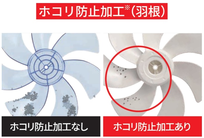 ※ 当社扇風機TF-30RK24(2021年発売/ホコリ防止加工なし)とTF-30DL29(2026年発売/ホコリ防止加工あり)の羽根を、30秒間摩擦後に発泡ビーズ(PS)の付着量を比較(当社調べ)。
