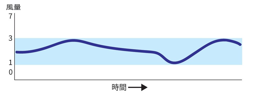 風量1~3の間で穏やかに変化し、タンポポの綿毛をふわりと運ぶようなやさしい微風を送り続けます。