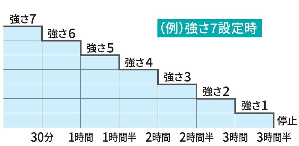 設定した強さで、30分毎に自動で強さが1段階ずつ下がり続けて、最後は停止します。(切タイマー優先)