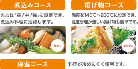 煮込みコース 火力は「弱」「中」「強」に設定でき、煮込み料理に活躍します。 揚げ物コース 温度を140℃~200℃に設定でき、温度管理が難しい揚げ物も簡単です。 保温コース 料理が冷めにくく便利です。
