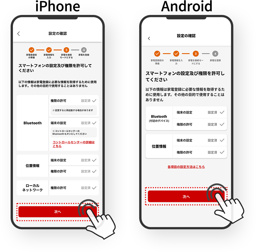 - 1エアコンの登録に必要となるBluetooth®、位置情報、ローカルネットワークの設定及び権限を許可して「次へ」をタップ