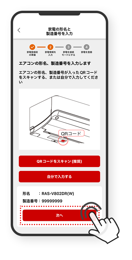 「QRコードをスキャン(推奨)」「自分で入力する」のいずれかの方法で家電情報を入力してください。