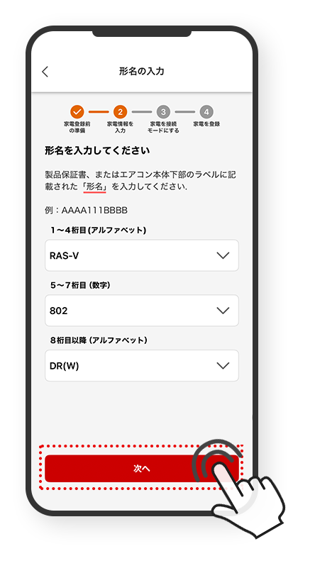 上記はN-DRシリーズの画面です。6.「エアコン+4ケタの英数字」が表示されたら選択し「次へ」をタップ。