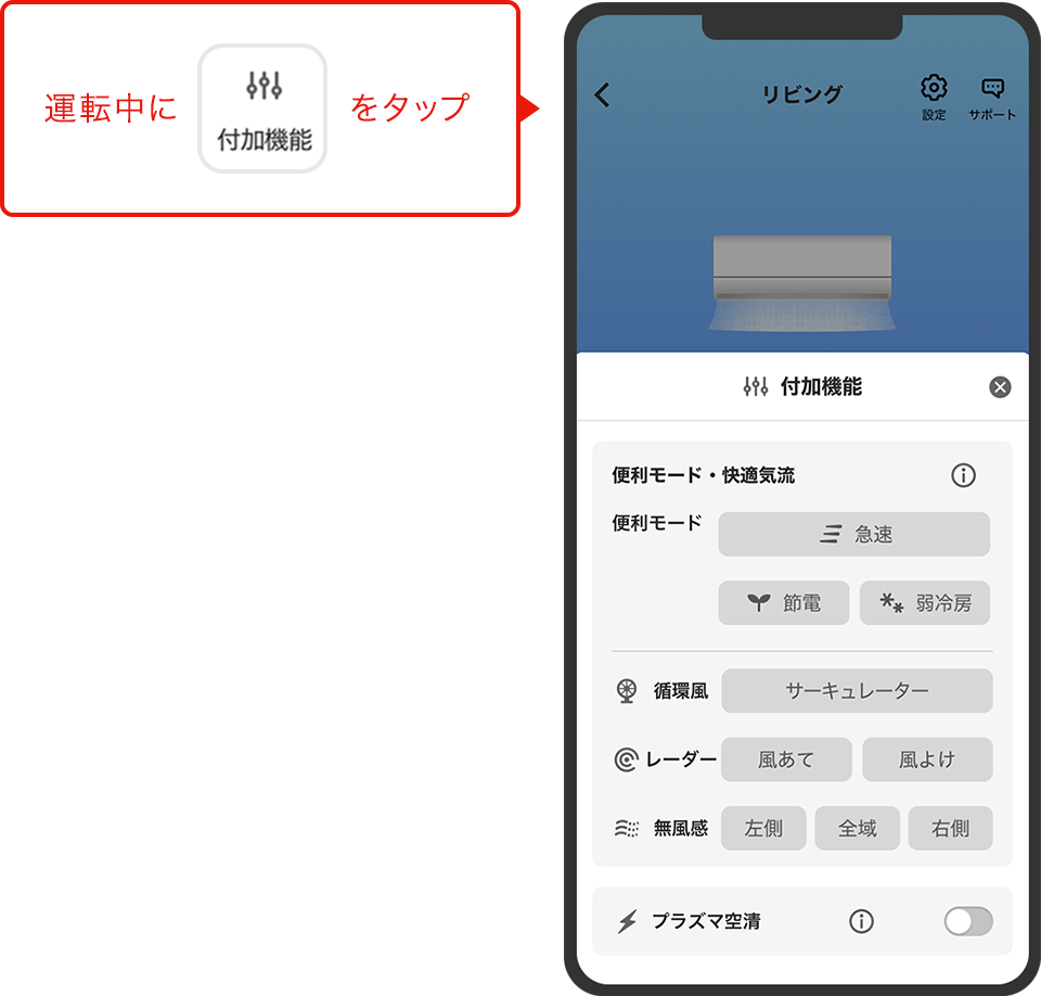 急速運転やレーダー、無風感などの付加機能を設定できます。