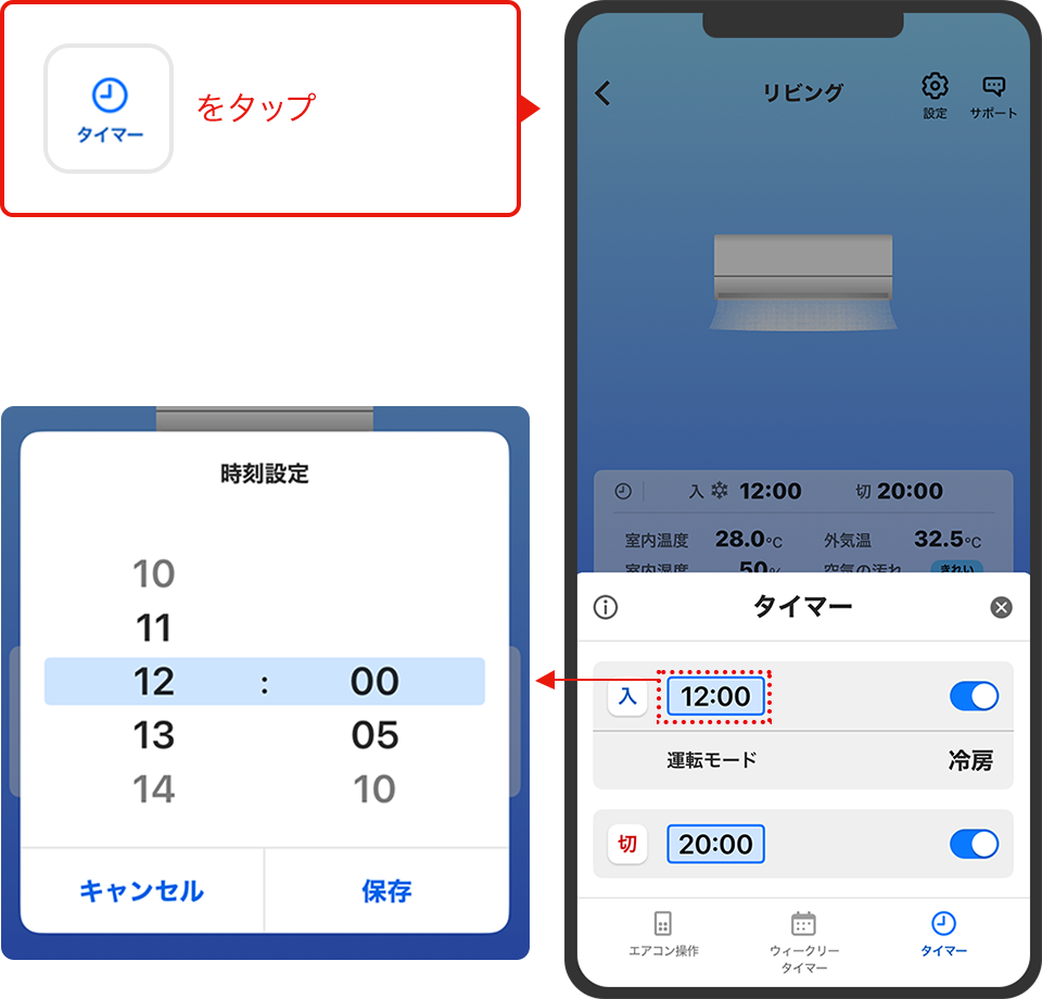 各曜日ごとにエアコンの入・切タイマーをセットすることができます。
