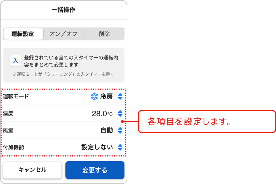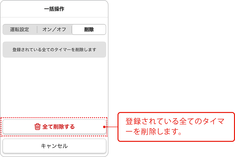 のいずれかをタッチして、入タイマーの設定内容をまとめて変更する「運転設定」、全てのタイマーをオンまたはオフする「オン/オフ」、全てのタイマーを削除する「削除」を切り替えます。