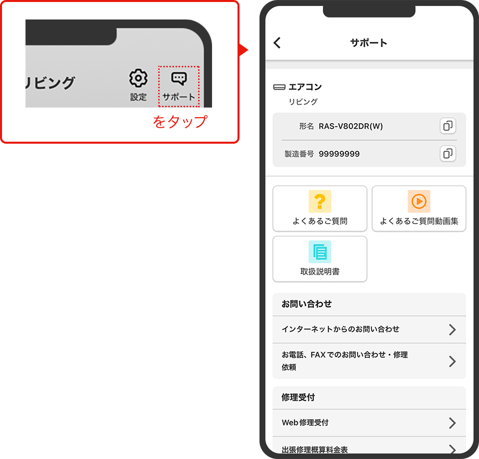 各種お問い合わせに関するWebページや修理についてのWebページを見ることができます。