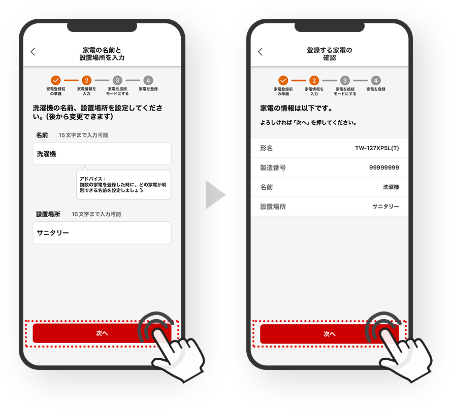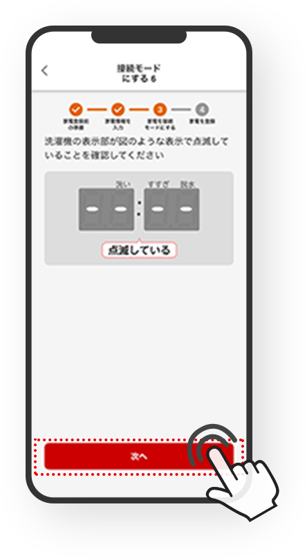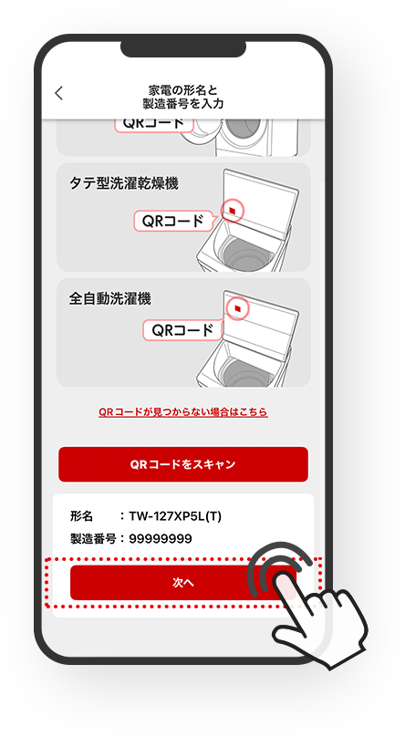 アプリ画面の「次へ」をタップタテ型洗濯乾燥機