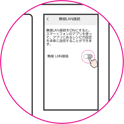 」を押し「設定」画面から、「無線LAN接続」を選択し、無線LAN接続をオン