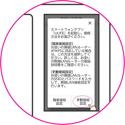 にし、「手動接続設定」を開始する。製品本体の画面はお使いの機種によって異なります。