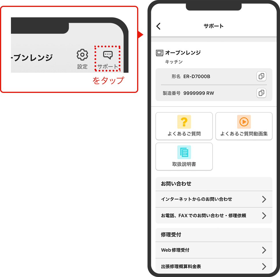 困ったときやオーブンレンジの使い方がわからないときのサポート情報をご覧いただくことができます。