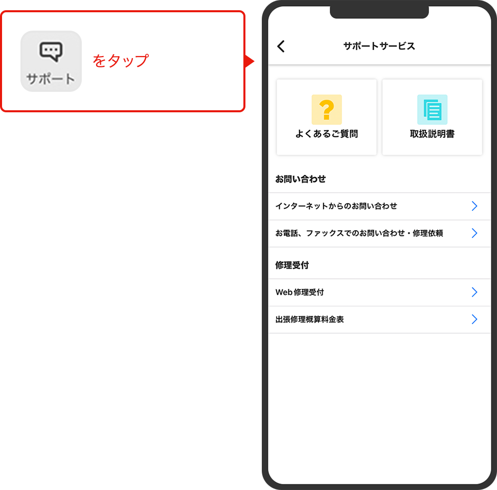 各種お問い合わせに関するWebページや修理についてのWebページを見ることができます。