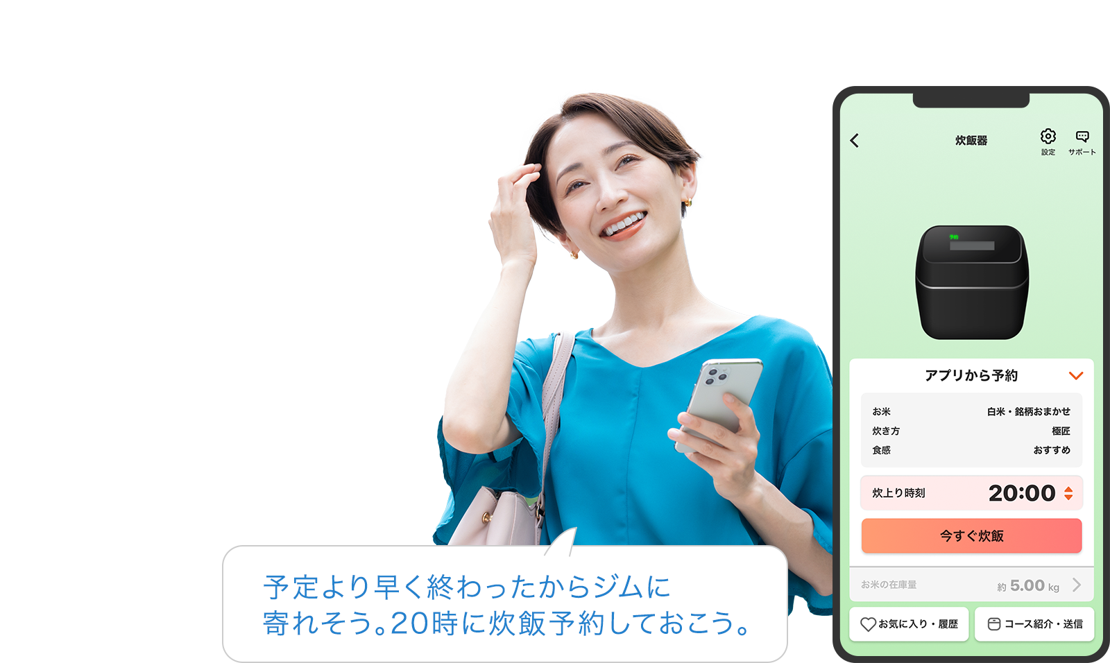 「IoLIFE」アプリと家電を接続することで、炊飯したコースをお気に入り登録、本体へ銘柄や炊飯コースの送信、