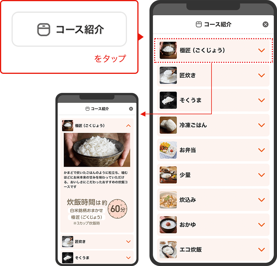 「本体コース紹介」をタップすると本体の炊飯コースを見ることができます。
