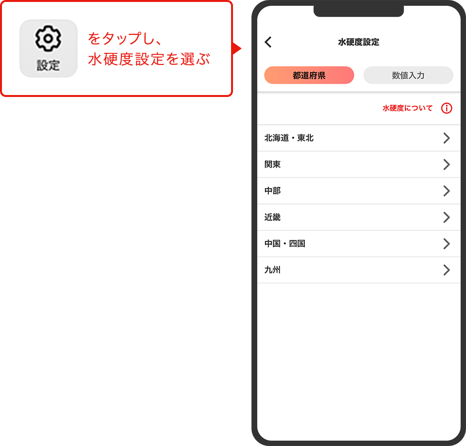 「水硬度設定」から本体の水硬度の設定をすることができます。
