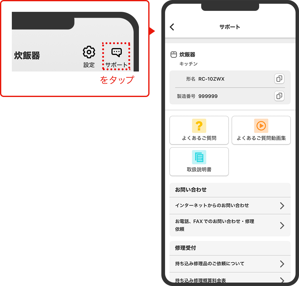 各種お問い合わせに関するWebページや修理についてのWebページを見ることができます。