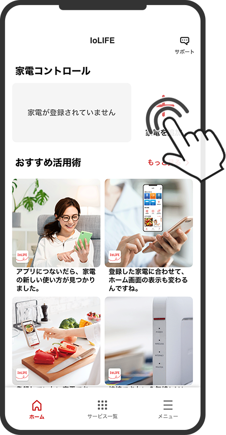 IoLIFEの一部機能は家電を登録しなくてもご利用いただけますが、家電コントロールなどIoLIFEをより便利にお使いいただくには、アプリに家電を登録いただく必要があります。以下の手順に進んでアプリに家電を登録してください。