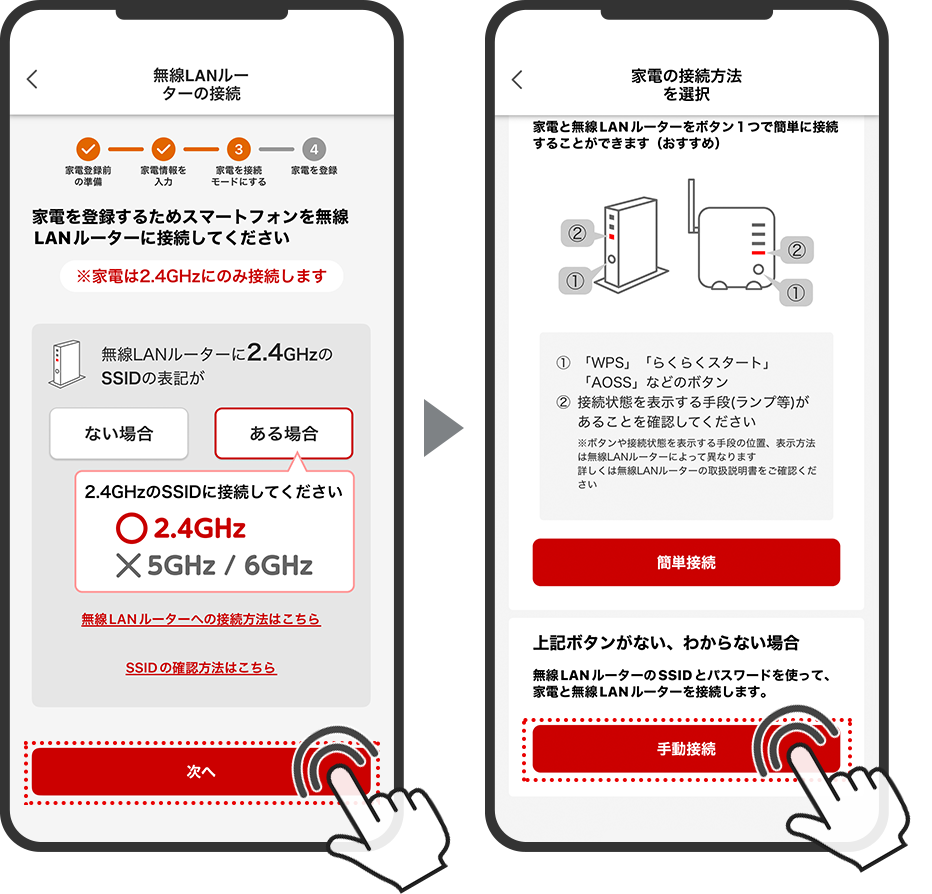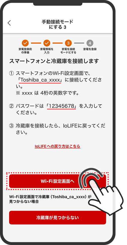 手動接続無線LANルーター及び冷蔵庫のSSID(ネットワーク名)、パスワードを直接指定して接続したい方はこちらから