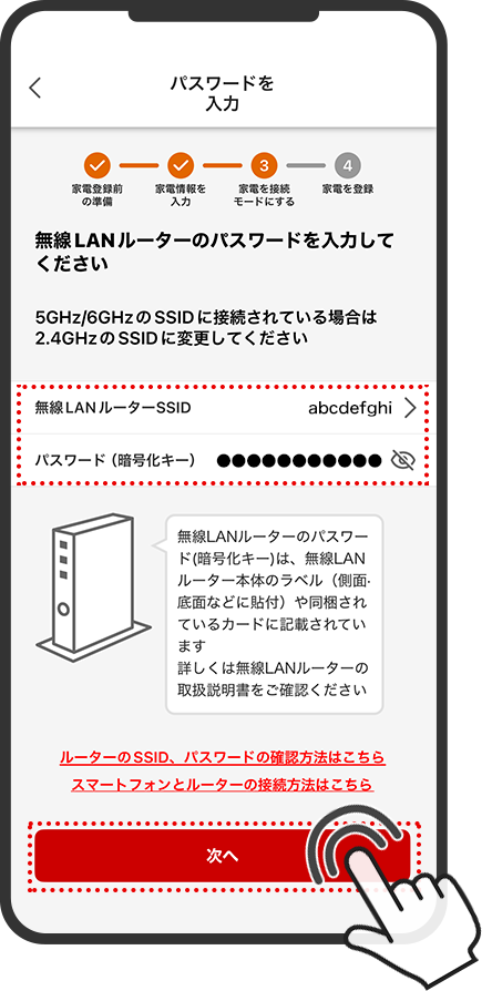 - 3画面にしたがって、接続する無線LANルーターのSSIDとパスワードを入力する