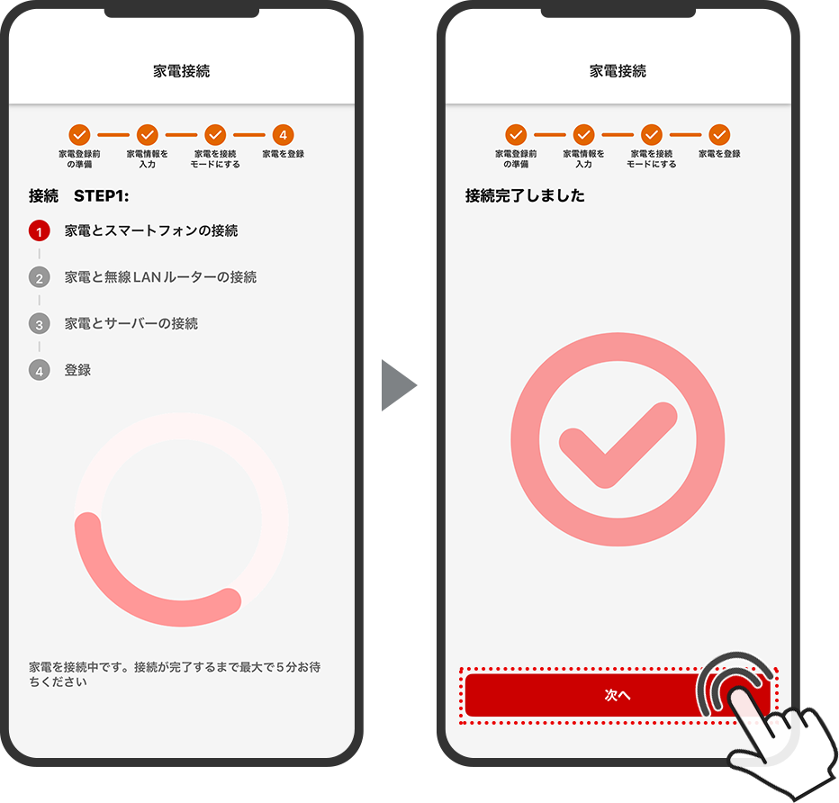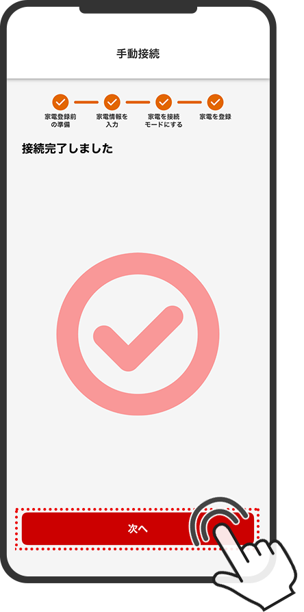 - 7接続が開始され、「接続完了しました」の画面になったら「次へ」をタップ