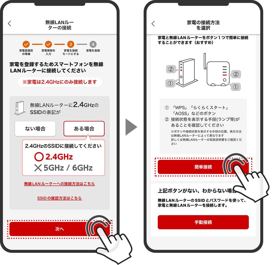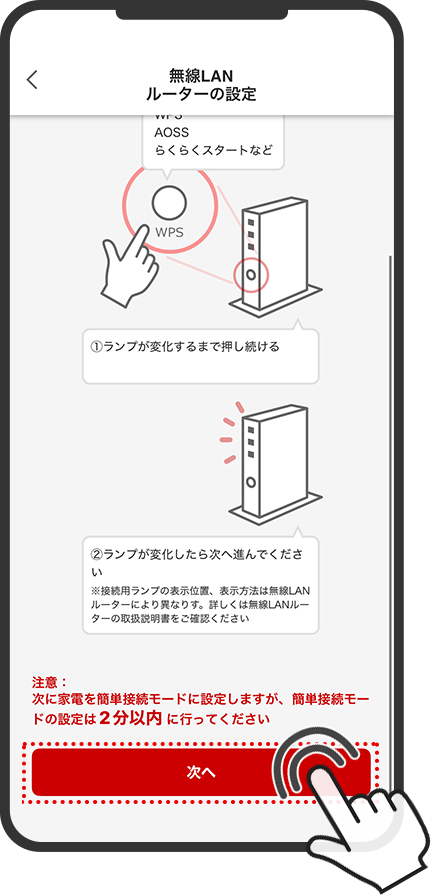 冷蔵庫の登録に必要となるローカルネットワークの設定及び権限を許可して「次へ」をタップ3. 無線LANルーターにある「WPS」「らくらくスタート」「AOSS」などのボタンを接続用ランプが変化するまで長押しして接続できる状態にする