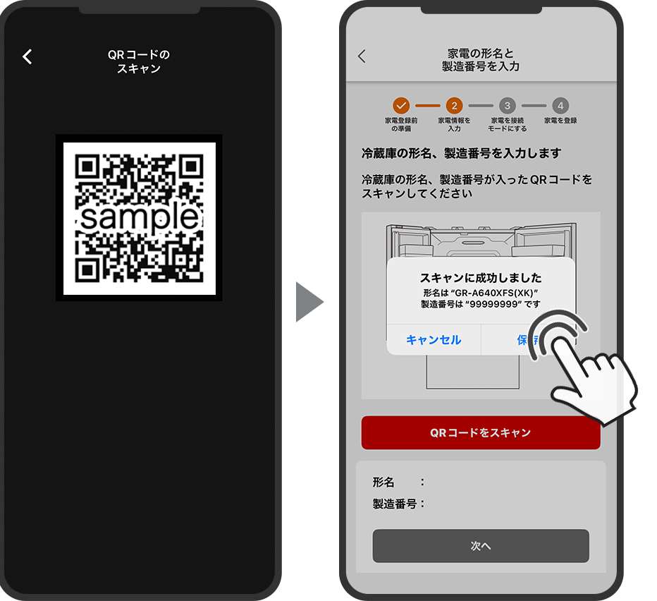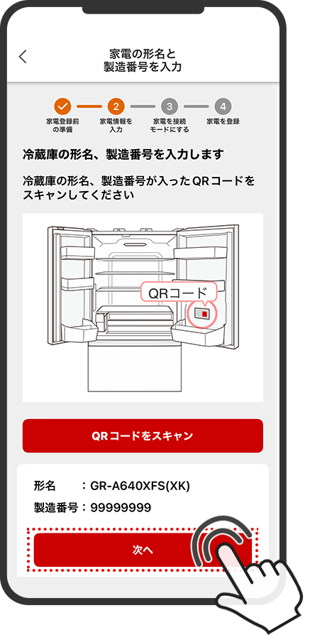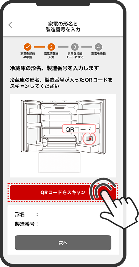 冷蔵庫の扉内側にあるQRコードをスキャンすると、自動的に入力されます。