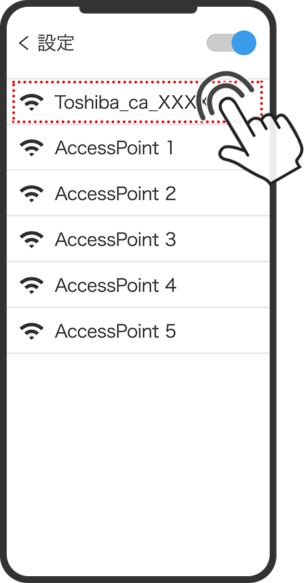 8. スマートフォンの「Wi-Fi」を開いて「Toshiba_ca_XXXX」をタップ