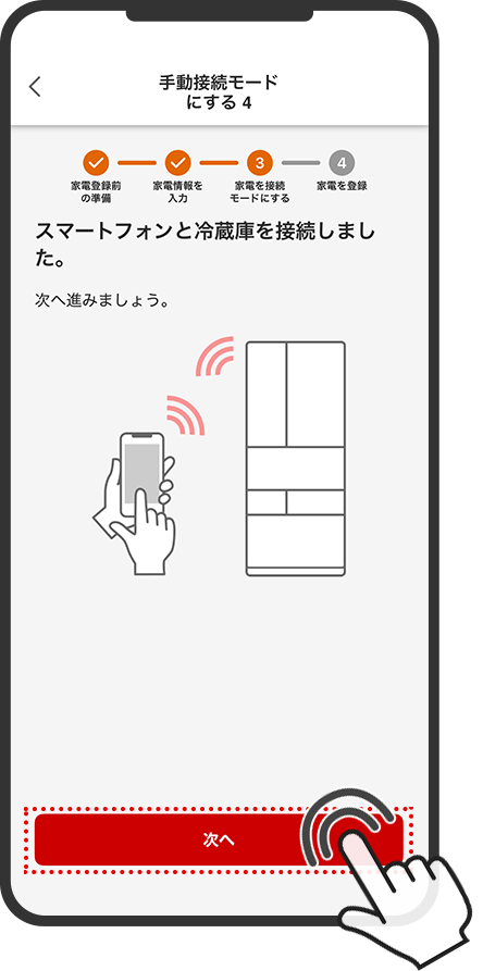 6. 5の操作後、冷蔵庫のアンテナマークが点灯または点滅に変わったら「次へ」「点灯または点滅している」をタップ