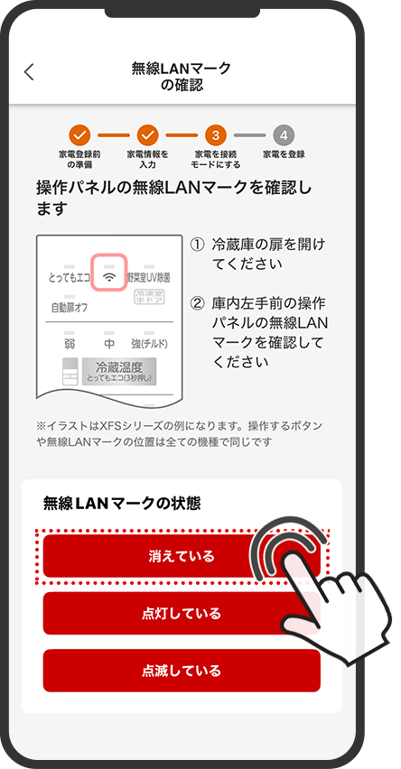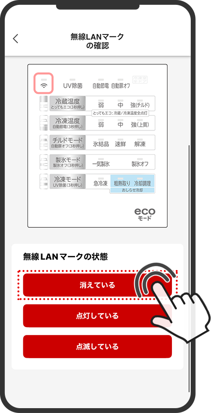 4. 冷蔵庫本体の無線LANマークが消えていることを確認し「消えている」をタップ