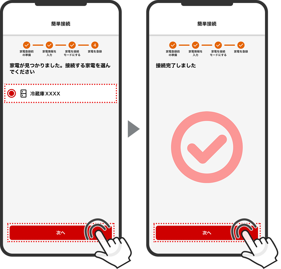 冷蔵庫接続完了※うまくいかない場合は、「よくあるご質問:[アプリ]接続がうまくできない(簡単接続の場合)」をご覧ください。