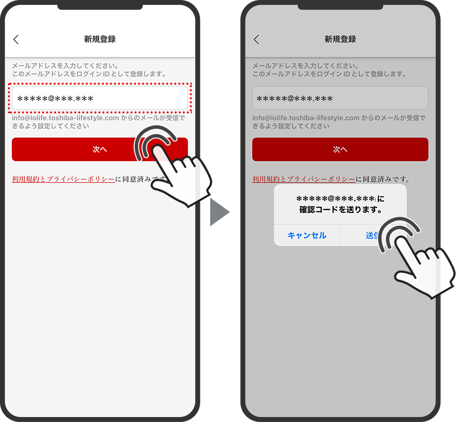- 3「メールアドレス」を入力し「次へ」をタップして、ポップアップの「送信」をタップ