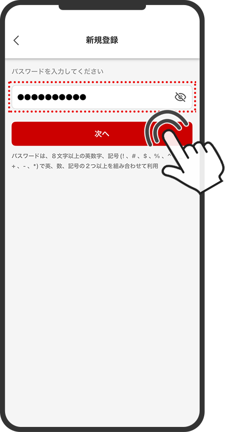 パスワードは、8文字以上の英数字、記号(!、#、$、%、^、_、+、-、*)で英、数、記号の2つ以上を組み合わせて設定してください。