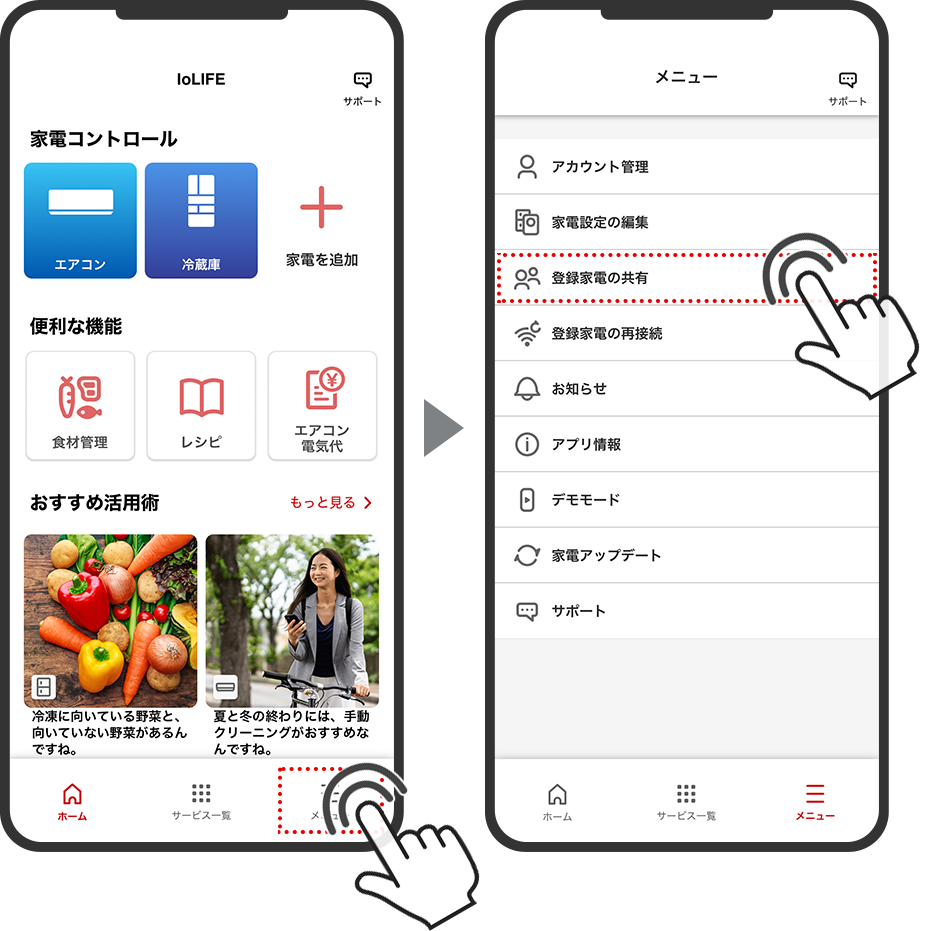 - 1ホーム画面の右下にある「メニュー」をタップして、「登録家電の共有」をタップ