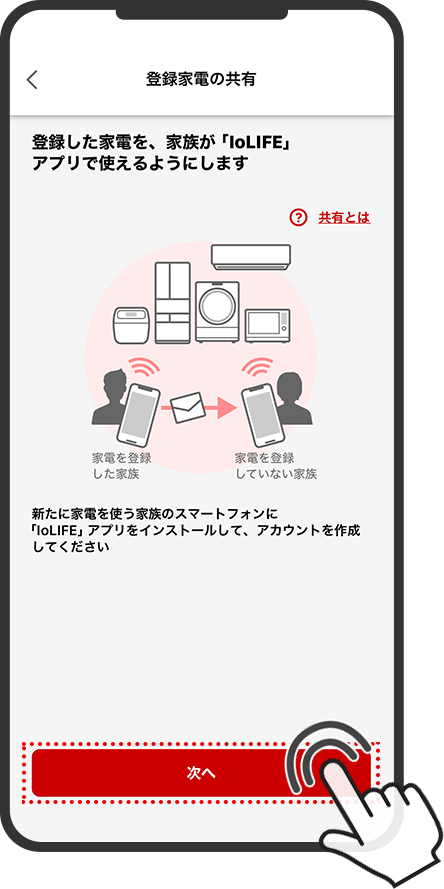 IoLIFEでは、最初の人が家電を接続登録し、二人目以降の人に家電を“共有”することで、みんながIoLIFE家電を操作することができるようになります。