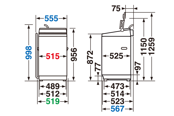 - 寸法図の青色は総外形寸法、赤色はボディ幅、緑色は左右の手掛け部を含むボディ幅を示しています。