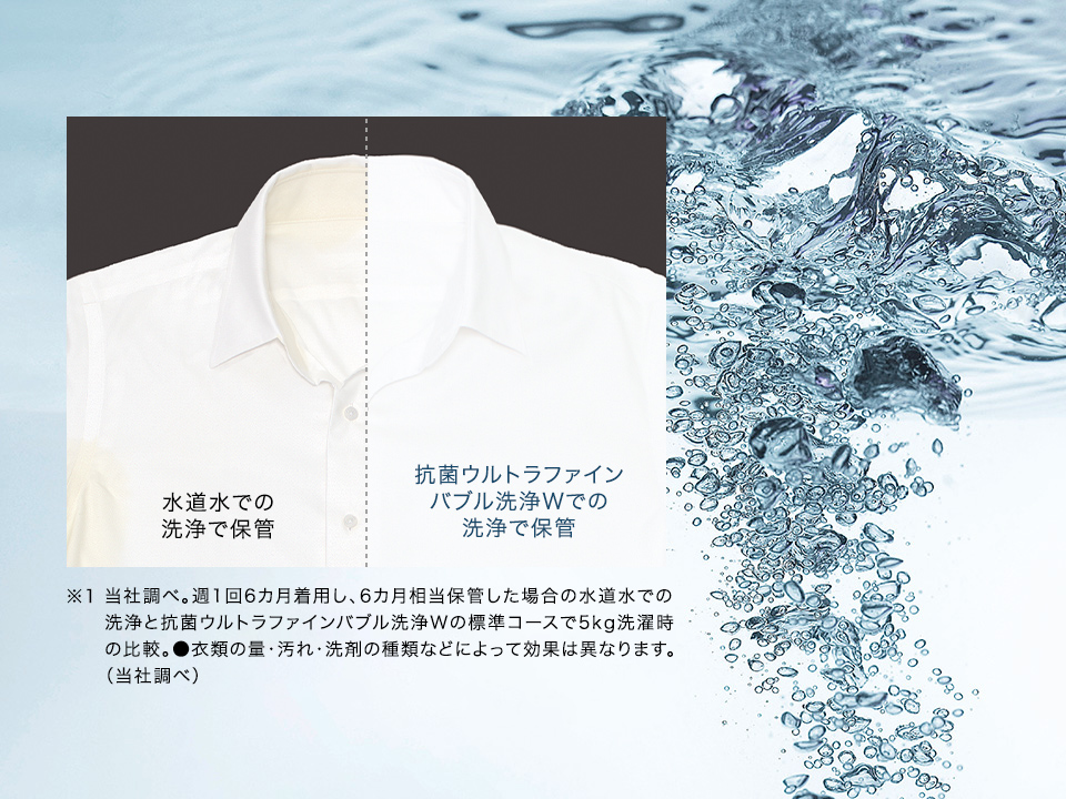 繊維の隙間より小さいナノサイズの泡、「ウルトラファインバブル」が洗剤のチカラを引き出し、皮脂汚れを落として黄ばみを予防。いつも通りのお洗濯で1年後の白さに違いがでます。※1