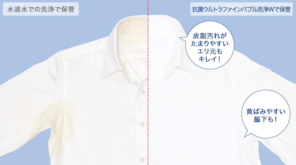 当社調べ。週1回6カ月着用し、6カ月相当保管した場合の水道水での洗浄と抗菌ウルトラファインバブル洗浄Wの標準コースで5kg洗濯時の比較。●衣類の量・汚れ・洗剤の種類などによって効果は異なります。