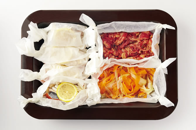 鮭ときのこの紙包み焼き:器に盛り付け、ポン酢しょうゆを添える。