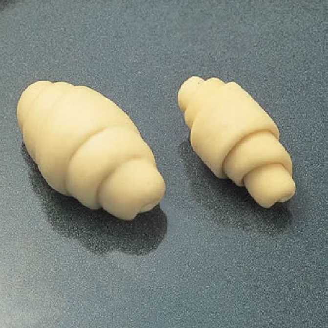 三角形にのばしたパン生地の細い方を少し手前に引っぱりながら、幅の広い方を手前に転がすように巻く(写真右から2番目)。