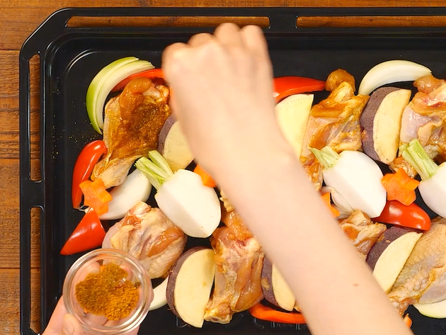 子供から大人まで大好きなカレー風味で、手羽元とたっぷり野菜を焼き上げます。
